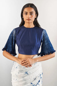 Featuring a medium-fit silk blouse with delicate chiffon Shibori sleeves, this piece blends structure with softness for an effortlessly elegant look.