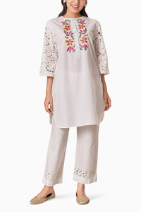 This white ensemble features a straight kurta with intricate floral embroidery on the front, adding a burst of color. The kurta's 3/4th sleeves are designed with delicate cutwork that complements the floral pattern, giving it a sophisticated and elegant touch. Paired with matching straight pants adorned with subtle embroidery at the hem, this outfit is a perfect blend of modern style and traditional craftsmanship.