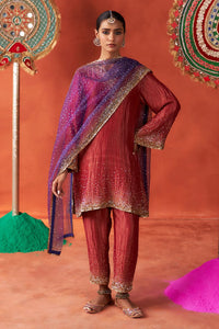 Nazaara Kurta Set featuring a red kurta and pants paired with a purple dupatta, crafted in pure silk tissue and pure silk organza. A delicate dusting of golden sequin embroidery adds festive radiance, perfect for a wedding function or an elegant card party.
