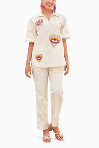 Step out in style with our playful Heart Evil Eye Co-Ord Set. This vibrant ensemble features whimsical heart and evil eye motifs, meticulously embroidered with colorful beads and threads. The contrasting orange stitch lines add a bold, modern twist, making this set a standout choice for a chic, coordinated look. Perfect for those who love to mix fun with fashion.