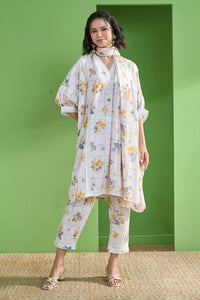 Crafted in soft rayon slub, this off-white printed kurta set blends feminine detail with flowy comfort. The V-neck kurta features delicate lace accents, while puffed quarter sleeves add a playful touch. It's paired with matching straight pants for a look that moves with you.