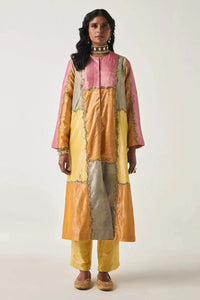 The Nazma Tissue Overlay comes together beautifully with a patchwork of handwoven silk tissue woven in pure silk and gold plated zari in vibrant contrasting hues. The pieces are held together by museum quality hand embroidery in dabka and zardozi in a border inspired by Mughal arches. The overlay works perfectly over your festive kurtas and can be worn buttoned up as a kurta as well.