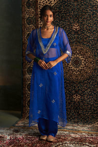 This Blue long Kurta is a showstopper for any occasion, radiating effortless elegance and refined sophistication. Crafted from luxurious organza, this sheer overlay kurta boasts exquisite hand-embroidered dabka and zari motifs across the fabric, with intricate gota and sequin detailing along the neckline and sleeves that adds a touch of opulence. Paired with a simple blouse and trousers, this ensemble strikes the perfect balance, allowing the stunning embroidery to truly shine. Ideal for formal events or special celebrations, this outfit ensures you make a lasting impression with grace, poise, and undeniable style.