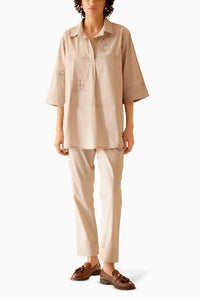 The Neela Tunic is a perennial favorite for warmer weather. This A-line tunic, made from 100% cotton poplin, showcases Chintz-inspired hand-embroidered motifs and pintuck details for a refined touch. Paired with matching narrow-fit pants featuring rolled cuffs and pintuck accents, this set offers a flattering length and timeless style that appeals to all ages.