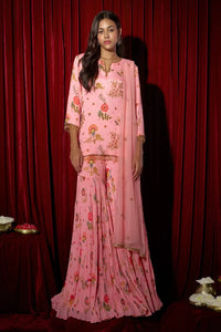 This elegant sharara set features an intricately embroidered kurta, matching sharara pants, and a beautifully embroidered dupatta. Perfect for festive wear.
