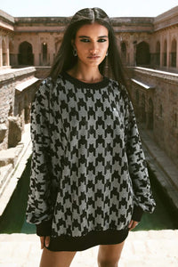 Black and silver houndstooth pattern oversized sweatshirt dress with crystal embellishment.