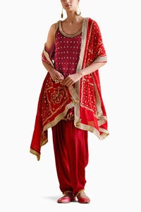 Featuring Neo Red Kurti by 5 Elements by Radhika Gupta from Mitti Collection. Embrace your desi diva vibes with our classic, hand-stitched Anarkali set. This festive favorite accentuates a red bandhini sleeveless Anarkali with a salwar and an embroidered dupatta adorned with goota, sequins, ghungroos, and metal peacock brooches.