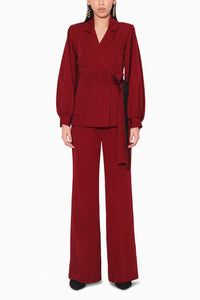 This wrap-style blazer set features statement sleeves and a belted knot side tie, creating a bold and feminine silhouette. The dramatic sleeves add volume and flair, while the side tie enhances the waist, making it a chic and versatile piece for both professional and evening wear.