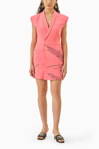 Neon pink crepe black heatpress studded extended shoulder blazer dress