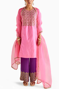 Featuring a neon pink embroidered kurta with purple embroidered hem pants with the same coloured dupatta.