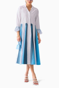 The Nerissa white cotton color block dress features a midi length with color block panels for a flattering A-line fit. With statement sleeves and scallop details on the cuffs, this concealed placket dress also includes side pockets. Designed with a fit-and-flared silhouette, it combines style and comfort effortlessly.