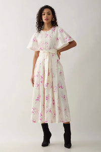 Nerul Dress in our grape Print a charming blend of fluidity and Minimalism. This off-white dress features a striking cape sleeve with delicate piping detail, adding a refined touch to its airy silhouette. A waist tie, seamlessly emerging from the side seam, cinches the look while mirroring the piping accents. The stitch-and-release pleating below the waist enhances movement, while intricate pleat detailing on the front adds depth and texture.A breezy yet polished piece perfect for effortless refinement.