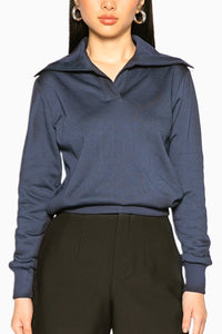 A long-sleeved top featuring a sailor collar and a V-neck opening. The design has a regular fit through the body and a slip-on closure. It includes a rib finish at the collar, cuffs, and hem, which provides a snatched, fitted silhouette at those points.