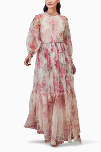 Featuring the Net Long Printed Dress With Fabric Braided Belt from Roseroom's Spring 2024 Collection. This ethereal piece, crafted from poly soft net, showcases delicate lace insertion and comes with a fabric braided belt, exuding elegance in white and pink hues.