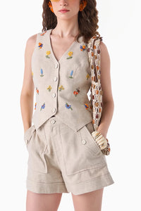 Featuring breathable linen composition, the Rosemary neutral linen embroidered waistcoat is adorned with delicate hand-embroidered florals. Designed with charming button details and a functional back adjuster, this fitted silhouette adds a refined, feminine touch to any look.