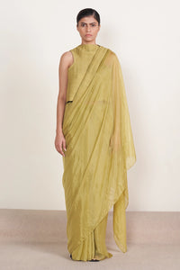 The New Leaf Repurpose Saree in leaf green is crafted from 100% vegan silk with a self-drape silhouette featuring repurposed cord detailing across the pallu. Paired with a sleeveless, high-neck corded crop top with a side zip closure, it blends sustainability with modern elegance.