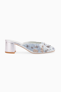 Featuring Neytiri Mule Heels by 5 Elements by Radhika Gupta. Immerse yourself in the fusion of traditional craftsmanship and contemporary style. Hand-embroidered with intricate florals in silk threads and beadwork, each pair is a testament to skilled artisans. Crafted for comfort and durability, they're the perfect blend of elegance and sophistication for any occasion.