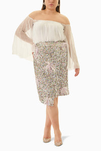 Nia Skirt is a micro sequins assymteric over lap mini skirt with tri color feather embellished with round and square stones. It has a conceal back zipper.