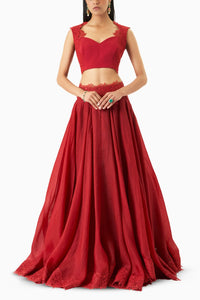 The ultimate red organza lace lehenga with the chic cropped blouse.