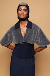 Featuring the Night Sky Layer Top, a cropped design with voluminous layered sleeves adorned with hand-embroidered loop texture. Transparent PVC cords are intricately looped for a modern, sculptural effect. The contrasting sharp collar and deep neckline create a bold, structured silhouette in a deep navy hue.