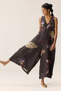 Featuring a charcoal-colored jumpsuit crafted in pure Belgian linen, featuring an all-over floral print for subtle elegance. It offers a comfortable fit with a front zipper and practical side pockets, blending style and functionality for everyday wear.