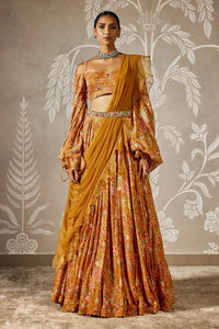 Drape yourself in elegance with the Niharika Lehenga Set, featuring a printed mulmul off-shoulder blouse with exaggerated sleeves and a plain mulmul lehenga. Paired with an organza ruffled net dupatta and a jeweled embroidered belt, this ensemble combines delicate prints with bold detailing for standout festive charm.