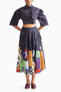 Featuring Nikki Black Shirt with Nikki Skirt by Saaksha & Kinni from Botanica Collection. This wave print collared cropped shirt showcases playful puff sleeves, pocket detailing, and a trendy cropped fit, adding a stylish touch to your outfit. Pair it with the tribal placement print high waist box pleat flared midi skirt, offering a vibrant pattern and a flattering, full silhouette for a chic, coordinated look.