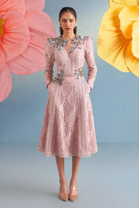 In a beautiful pink hue, this A-line skater dress is designed to accentuate the body with soft structure and movement. Embellished with multicolored sequin roses tracing the silhouette, it channels the elegance of the English era and the romance of Paris — ideal for evening wear and formal affairs.