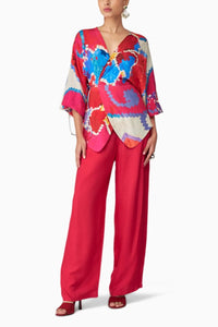 Featuring Nina Ikat Wrap Blouse & Mia High-Waist Palazzo by Saaksha & Kinni, this stylish set includes an Ikat print-inspired wrap blouse with a tie waist and adjustable tie-up sleeves. Paired with high-waist palazzo pants featuring pockets for a chic, comfortable, and contemporary look.