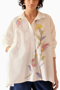 The Nina Shirt effortlessly transitions from day to night with its vibrant Chintz-inspired embroidery patches. Crafted from 100% cotton poplin, it features colorful floral patchwork, a classic shirt collar, buttoned cuffs, and stylish side slits. This shirt adds a touch of glamour to any occasion.