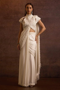 Featuring Nirvi Ivory Embellished Hi Neck Blouse with 2-Way Draped Saree by The House of Exotique's Nagma Collection. The hi-neck blouse with cap sleeves is padded, fully embellished, and fastens with a center back hook and zipper. The pre-draped 2-way saree features a lace border, thin embroidery, and tassels and feathers at the pallu, with a side zipper fastening. Crafted from Lycra satin, Chantilly lace, and net, this ivory ensemble radiates sophistication and grace.