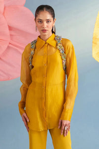 Composition- Pure Silk Organza and Stretch Satin Inner Color- Mustard Yellow Details- Multicolor 3D Floral Work Components- 3 Product Code- SVEPARUSS25SHRT033