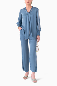 Elevate your style with the Nobu Petrol Bamberg Satin Top paired with matching pants. The luxurious satin top features twill tapes on the shoulders and sleeves, a button-down design with a concealed placket, and playful front tie knots, all in a relaxed fit for ultimate comfort. Complementing the top are straight-fit ankle-length pants, designed with an elasticated waist for a perfect fit. The pants include convenient side pockets and stylish twill tapes along the sides, creating a chic and cohesive look that’s perfect for any occasion.