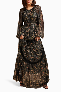 Featuring Nocturnal Bloom Long Dress by Roseroom, a Black Printed Dress with off-white flowers and lace detailing. Crafted from French Chiffon, adorned with printed embroidery and delicate laces, it offers a standard fit for an elegant and captivating ensemble.