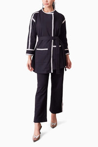 This black fleece coord set with contrast white tape detailing and a front tie offers sleek style to your fashion-forward winter looks.