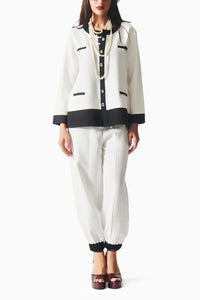 This elegant coord set features a tailored cardigan and joggers, showcasing a striking color-block silhouette. The cardigan boasts a refined fit, adding a touch of sophistication, while the joggers offer both comfort and style. Together, they create a chic ensemble that effortlessly balances casual and polished aesthetics, making it perfect for a variety of occasions.