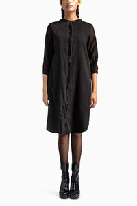 Celestial Dress- Regular fit front open button-down mandarin collar long shirt-dress with light gather on the sleeve and curved hem detail. They are constructed in solid 100% cotton satin fabric with cotton silk lustrous sleeves. Finished with our signature handwork in golden thread detail the dress is carefully placed to amuse the wearer.