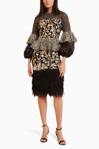 Featuring Noir Flora Jaal Glam Mesh Bling Peplum Top by Siddartha Tytler from Checkmate Collection. Redefine elegance with the black peplum top, adorning mixed media tiers. This top combines textured fabrics and layered tiers to create a dynamic silhouette, offering a chic and sophisticated look that enhances any outfit.