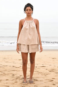 Introducing the Noir Halter Tie-Up Top, a relaxed-fit piece that combines comfort and style. This chic top features a stylish tie-up design and beautiful embroidery around the armholes, adding a touch of elegance paired with Odessa Elasticated Shorts, designed for comfort and style. These wide-legged shorts feature an elasticated high waist for a perfect fit and convenient side pockets
