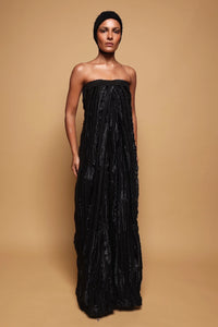 Featuring the Noir Jumpsuit, an elegant strapless black piece with a dramatic, flowing silhouette. It showcases textural vertical embellishments crafted from an exclusive handloom-developed textile. Comfortable yet statement-worthy, it is ideal for evening wear.