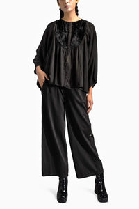 Front button-down detail top, featuring tone-on-tone velvet yoke and voluminous sleeves. Finished with our signature handwork in golden thread detail the dress is carefully placed to amuse the wearer. Paired with solid relaxed fit trousers finished with intriguing button cross details.