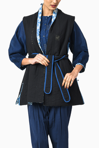 Featuring the Noir Quilted Jacket by Jayati Goenka. This solid black cotton quilted jacket is a versatile addition to your wardrobe. Lined with block-printed, natural-dyed cotton for softness, it showcases intricate handwork details in golden thread. Complete with a quilted belt, it offers effortless styling and timeless elegance.
