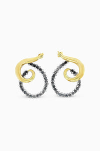 A striking fusion of elegance and edge, the Noir Swirl Earrings by Miapia feature graceful gold swirls paired with a dramatic arc of interspersed black gemstones and diamond moissanites. Crafted in vermeil gold over sterling silver, these earrings blend fluid design with bold contrast, creating a unique statement piece. Perfect for evening events or adding a sophisticated twist to your outfit, these demi-fine jewellery earrings exemplify Miapia’s commitment to sustainable luxury and modern style.