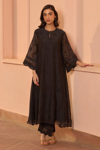 The Noir Thread Embroidered Co-ord Set is adorned with delicate floral embroidery scattered across the airy kurta, while sheer sleeves lend a touch of understated sophistication. Coordinating pants with embroidered accents complete the ensemble, resulting in a polished and effortlessly elegant look.