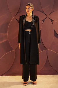 Noir black trench co-ord set includes an embroidered highlighted trench work on the collar with dori,cutdana, dabka, stonrs and threads paired with a bustier, waist belt and straight pants.