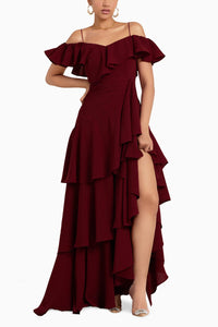 Featuring Nolita Mahogany Dress by Malie. This cold shoulder dress has a design that exposes the shoulders, complemented by a ruffled skirt. It includes hand-draped detailing at the waist and a high slit on the left leg, adding a touch of allure. The dress drapes loosely over the hips and falls to the ground, creating an elegant and sophisticated look.