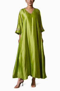 Adorn yourself in the serene elegance of this gracefully long dress, which gracefully sweeps to just above the ankle. The relaxed and comfortable fit is perfect for any occasion, while the sleeves are beautifully enhanced with exquisite hand-embroidered zardozi, offering a luxurious touch. The scalloped neckline provides a sophisticated detail, and the high slit adds a modern allure. This dress is designed for the woman who radiates poise and elegance.