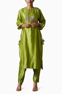 Composition: Chiniya Silk Color: Green Embroidery: Embroidery Fit: Comfortable Model Height: 5'7 Size that Model is wearing: M Components: 2 ProductCode: SVEEEDA_Noor Green Kurta Set_M