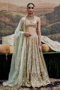 Powder blue organza Lehenga with mirror work and delicate elephant motif embroidery is done on the lehenga , paired with a mirror work blouse and organza dupatta with gota on the border.