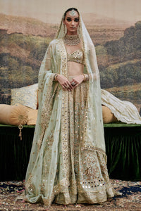 Powder blue organza Lehenga with mirror work and delicate elephant motif embroidery is done on the lehenga , paired with a mirror work blouse and organza dupatta with gota on border additional to the dupatta a veil is styled to complete the look.